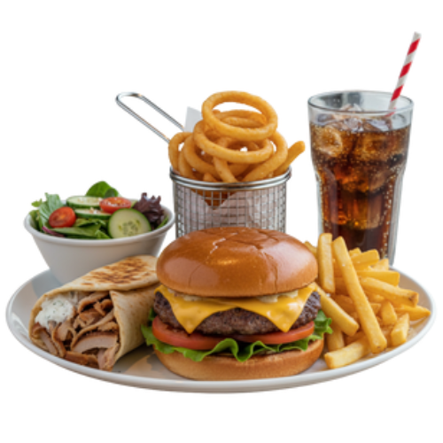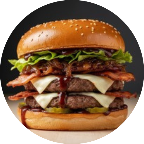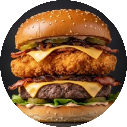 Seasoned fresh beef patty, fresh chicken fillet, 2 American cheese, caramelised onion, lettuce, gherkins, house sauce, and turkey bacon