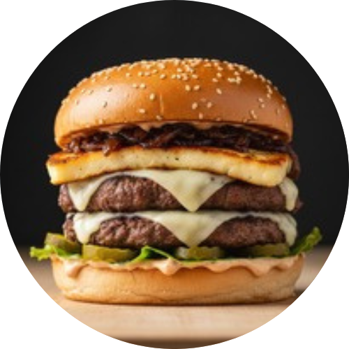 2 Seasoned fresh beef patty, American cheese, caramelized onion, lettuce, gherkins, house sauce, halloumi, and potato brioche bun
