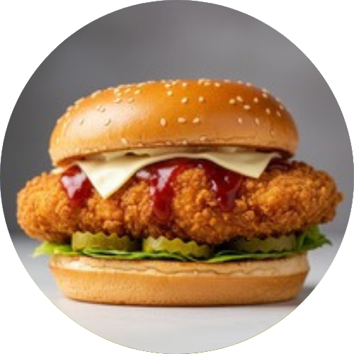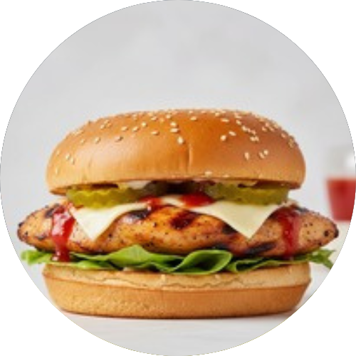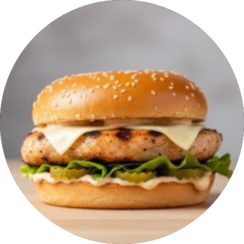 Fresh chicken breast, American cheese, lettuce, gherkins, house sauce, and potato brioche bun