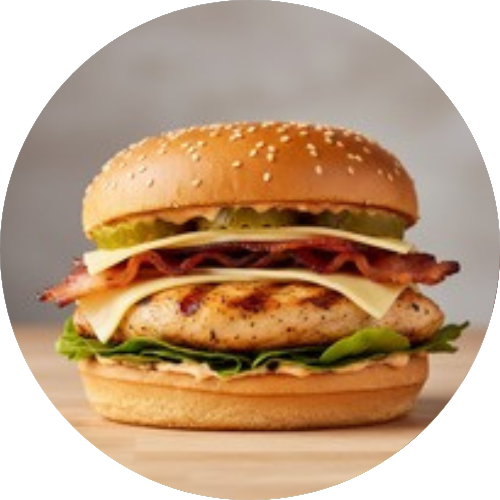 Fresh chicken breast, American cheese, lettuce, gherkins, turkey bacon, spicy mayo and potato brioche bun