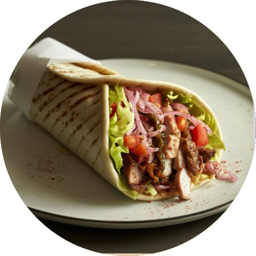 £9.99Soft handmade pitta, chicken gyros marinated in Greek herbs, fries, tomatoes, onion, lettuce, served with your choice of sauce, finished with oregano, paprika, and parsley