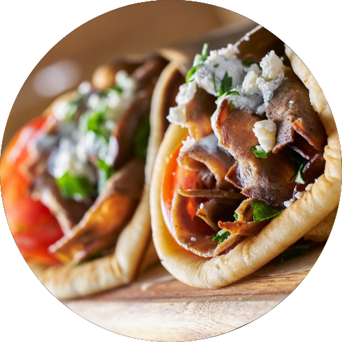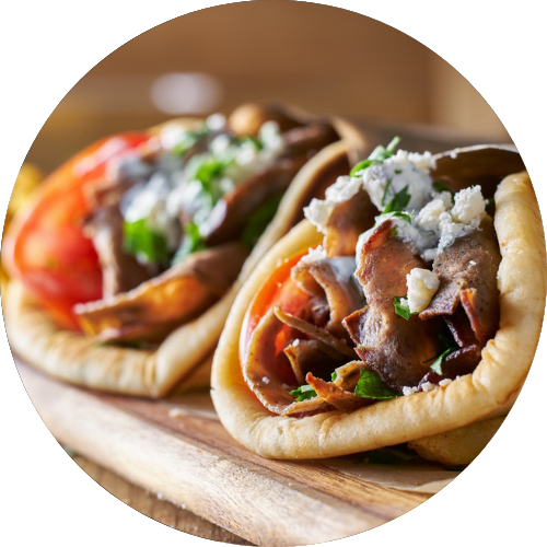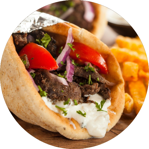 £9.99Soft handmade pitta, chicken souvlaki gyros marinated in Greek herbs, fries, tomatoes, onion, lettuce, Served with your choice of sauce, finished with oregano, paprika, and parsley